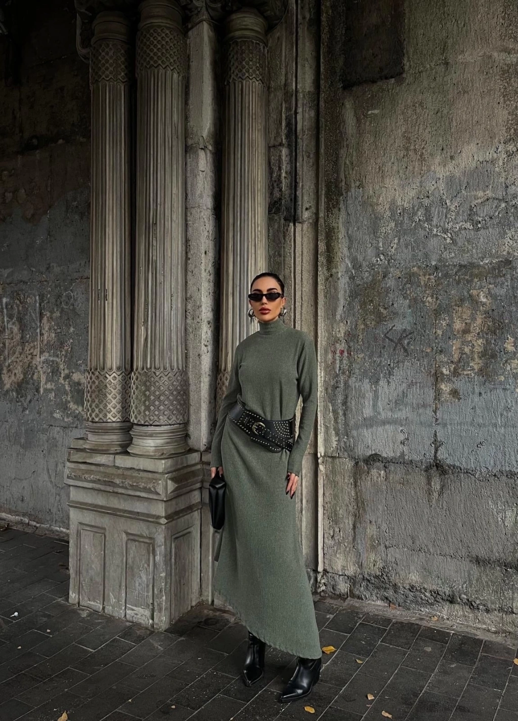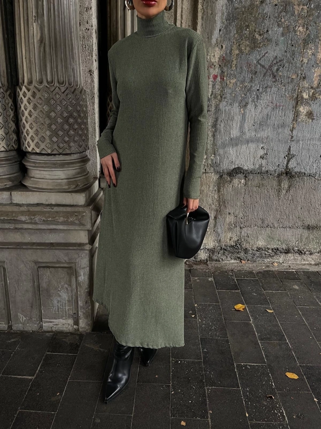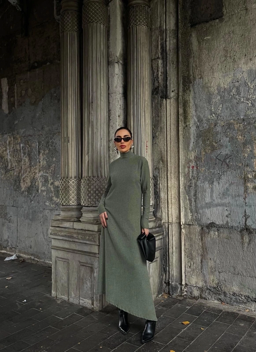 • Boğazlı kalın bürümcük uzun elbise yeşil