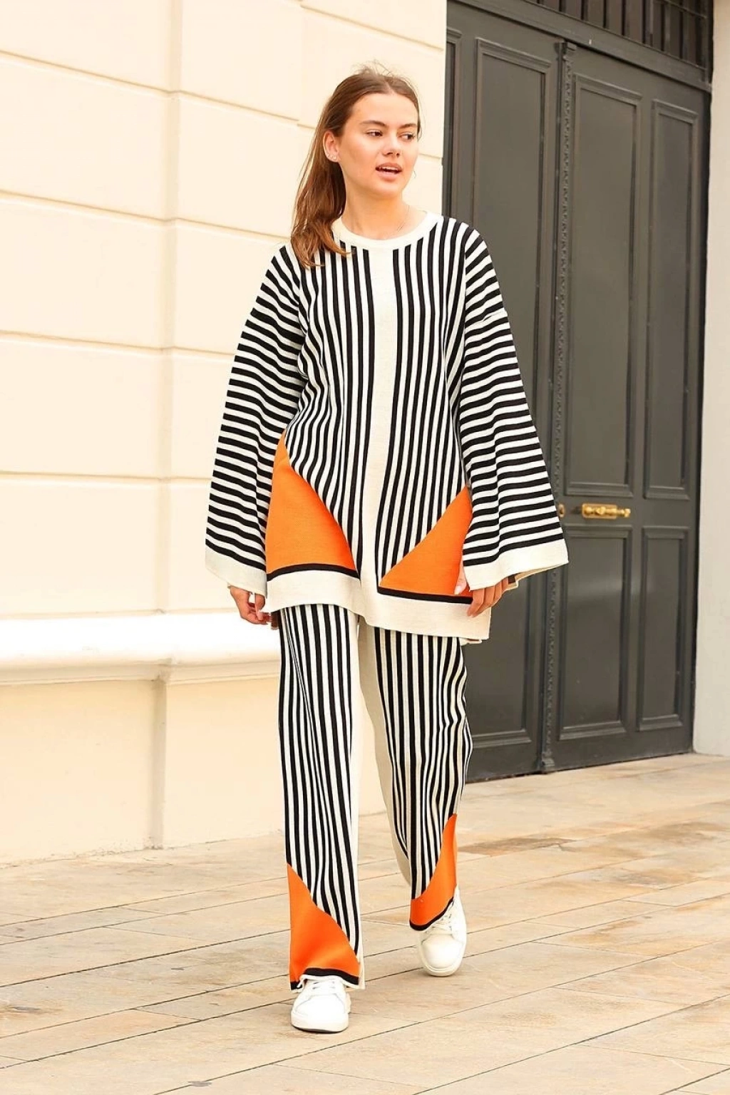 Çizgili bisiklet yaka triko takım beyaz, şıklığı ve rahatlığı bir arada sunar.