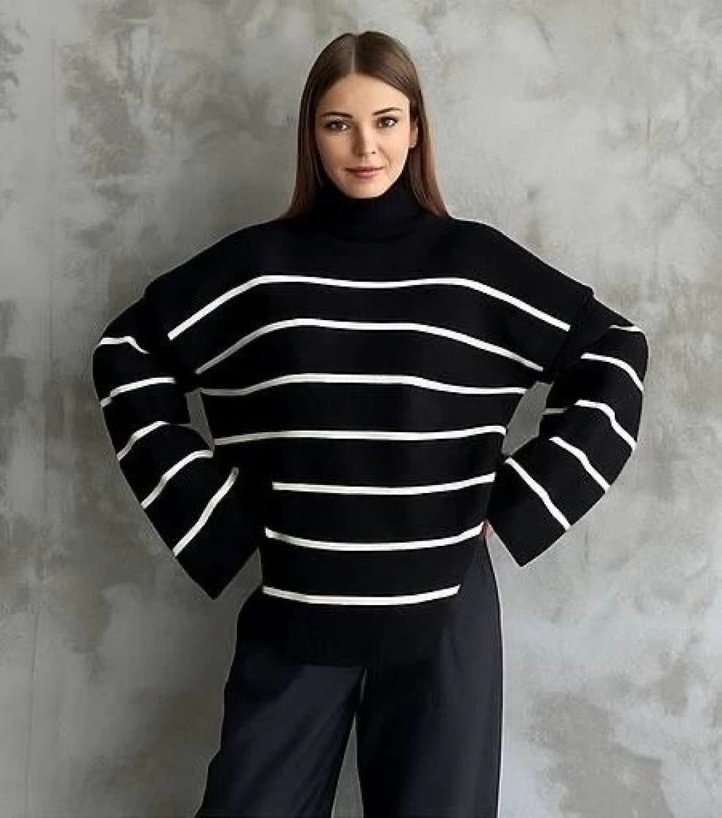 Çizgili ispanyol kol triko boğazlı kazak siyah elf
