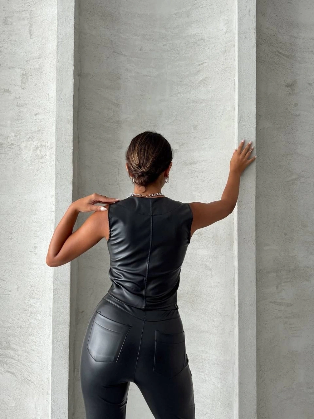 Kaplama düğmeli deri yelek siyah s24398