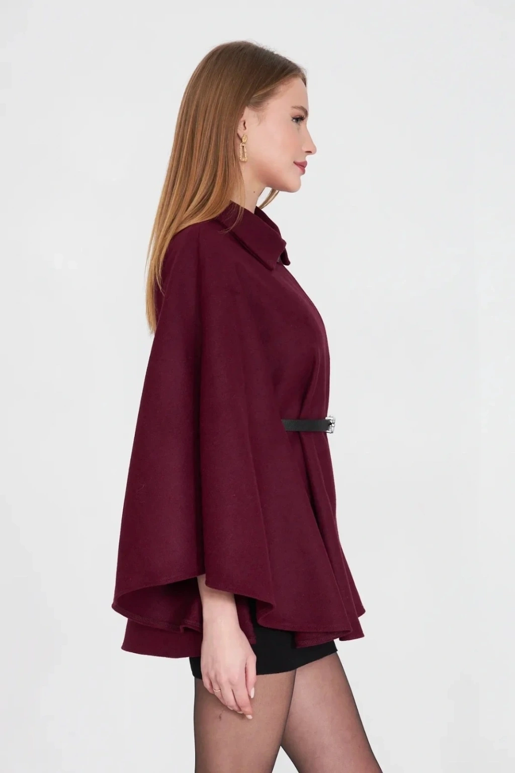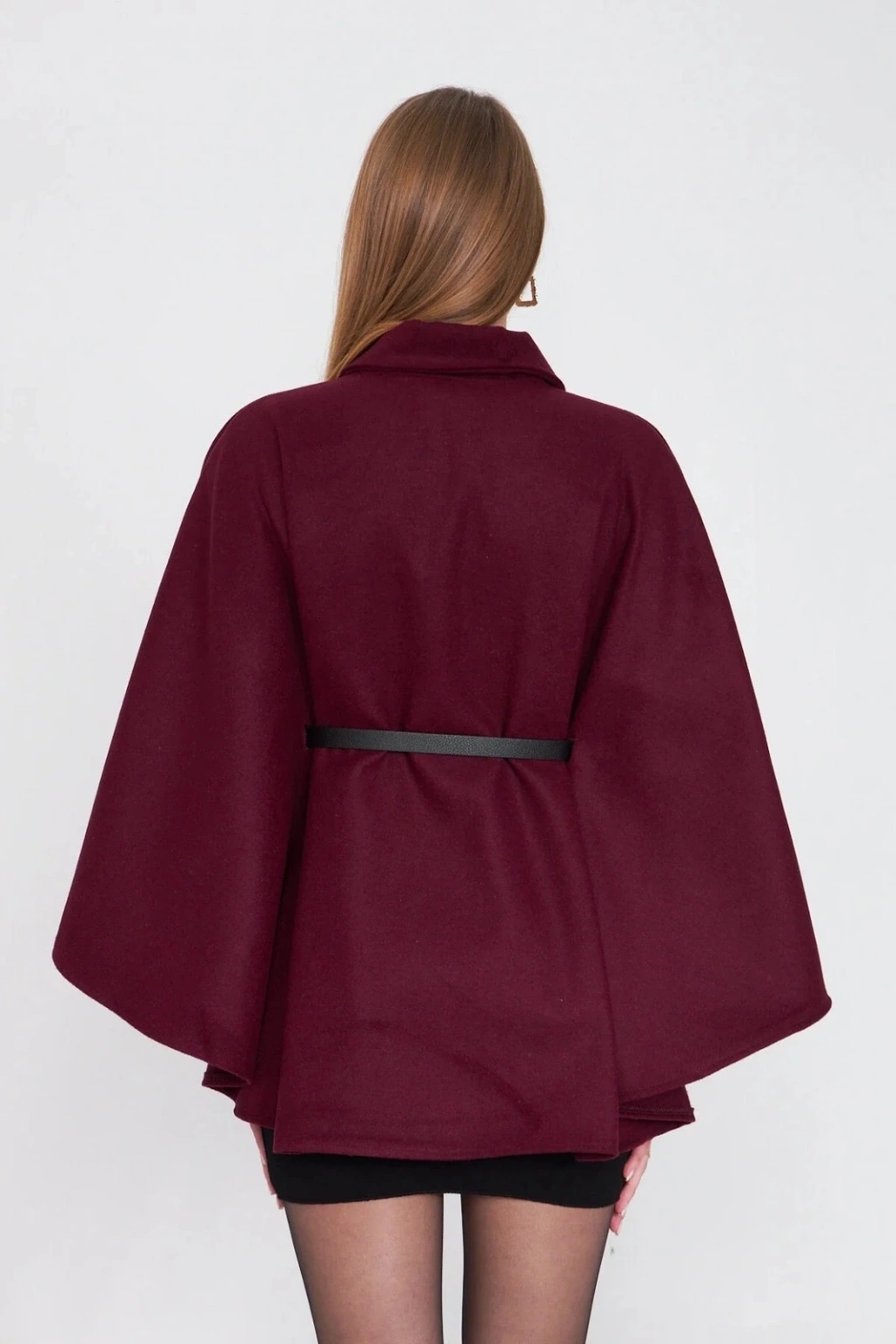 Bu kışın vazgeçilmezi olmaya aday kemerli kaşe panço bordo, şıklığınızı tamamlayacak bir parça.