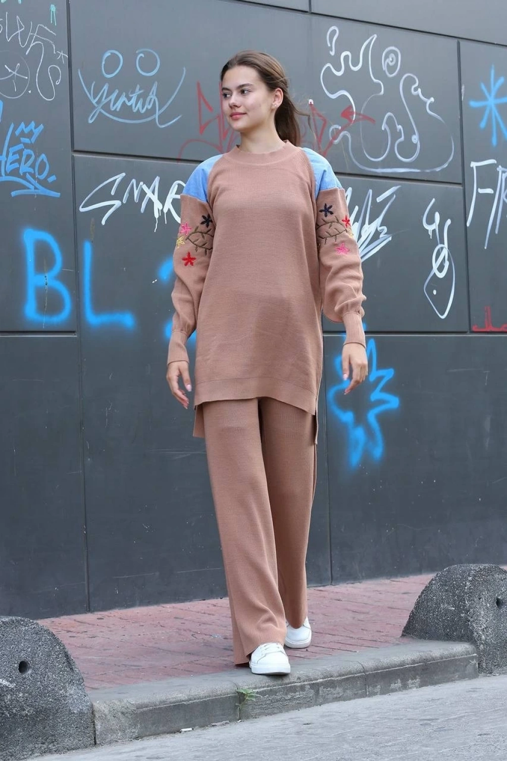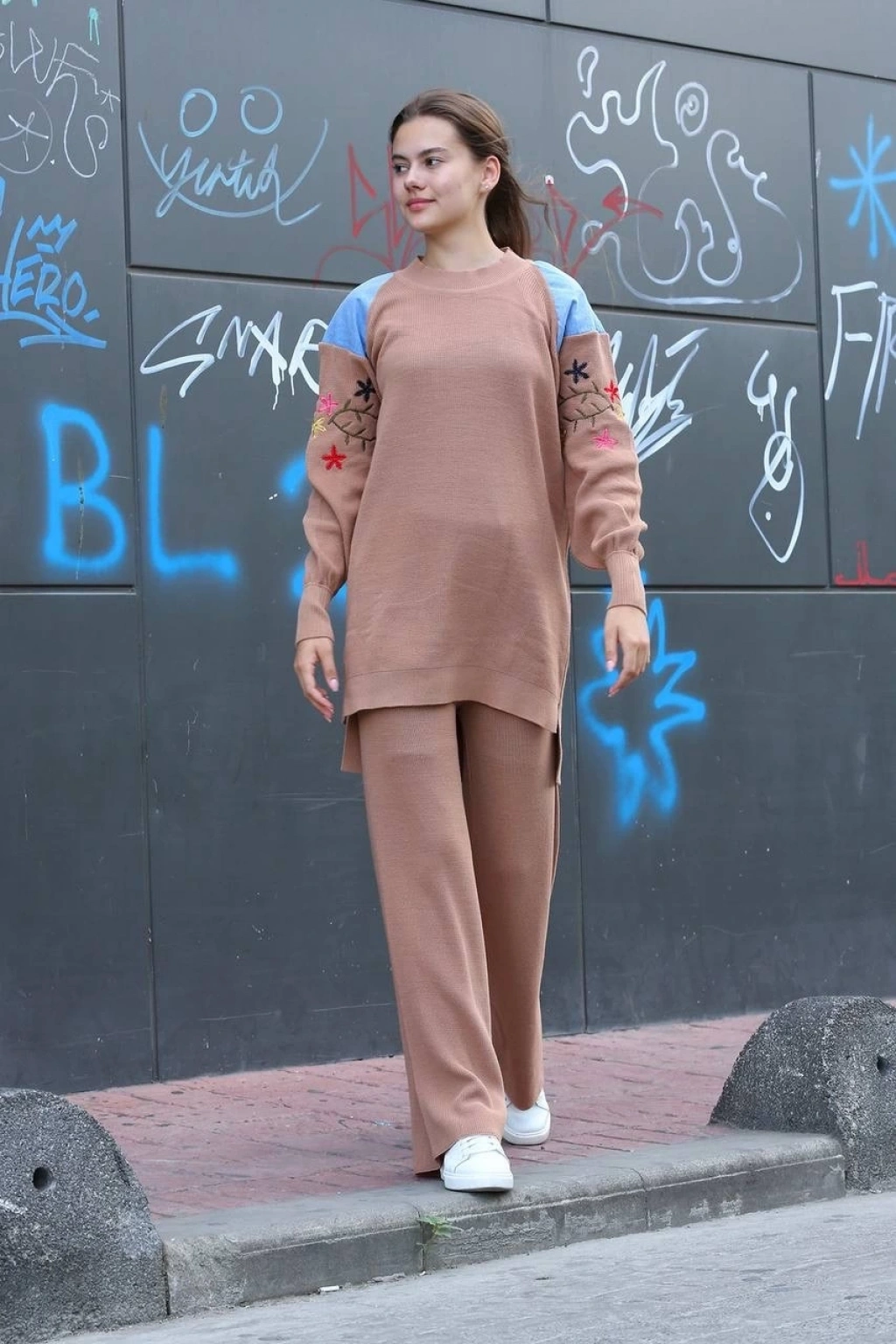 • Omuz detaylı kol nakışlı ikili alt üst triko takım vizon