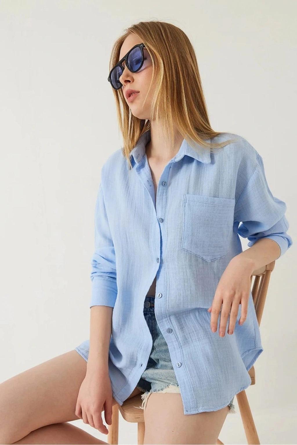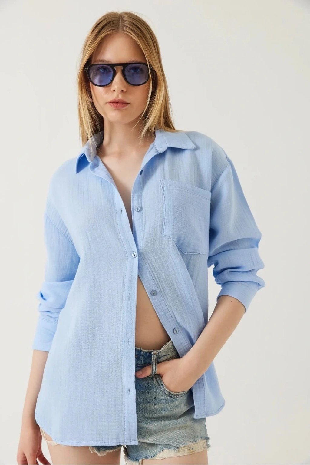 Bu mavi tek cepli müslin gömlek, gardırobunuzun vazgeçilmezi olmaya aday! Zarif tasarımı ve rahat kesimiyle şıklığı ve konforu bir arada sunar.