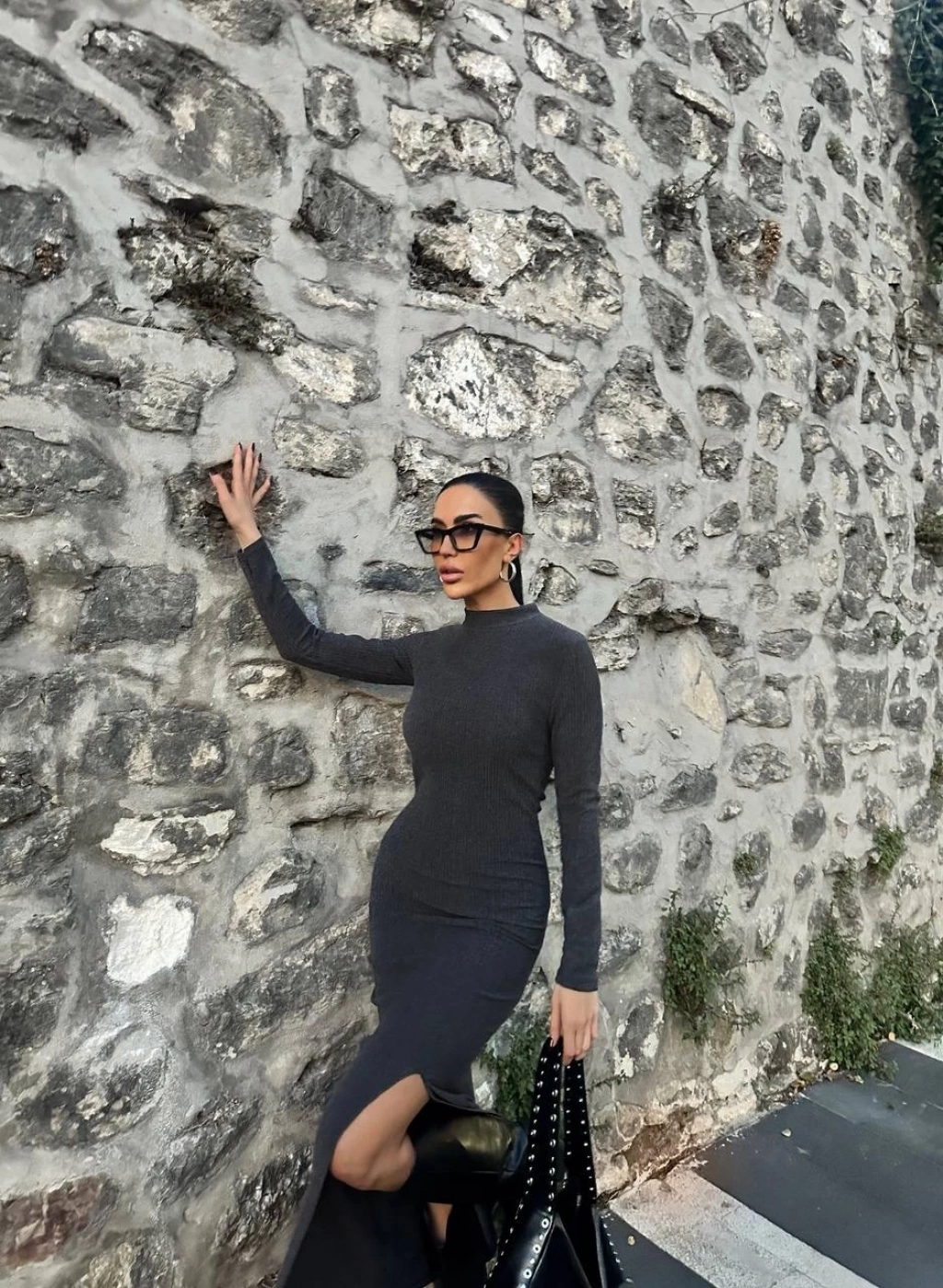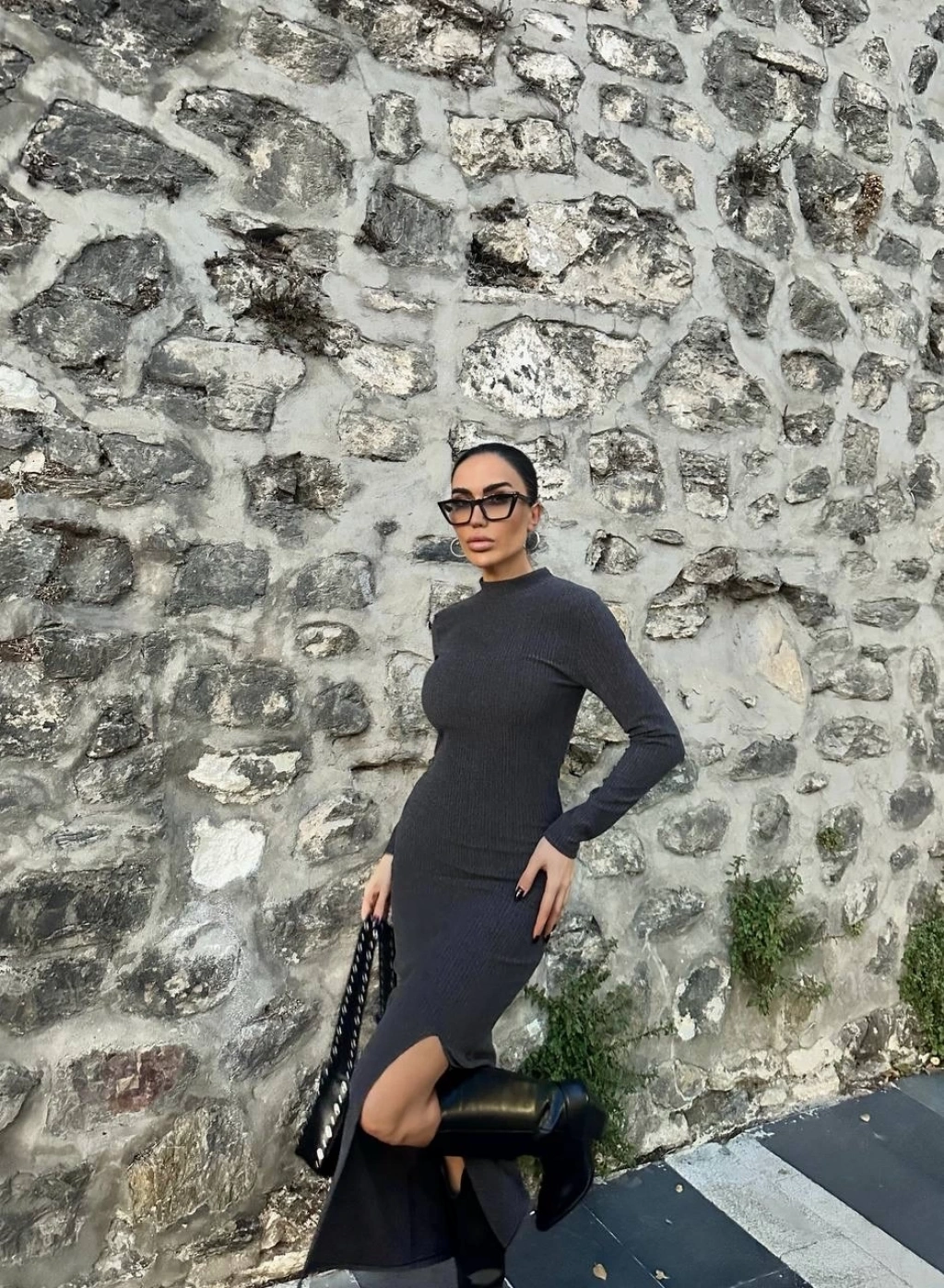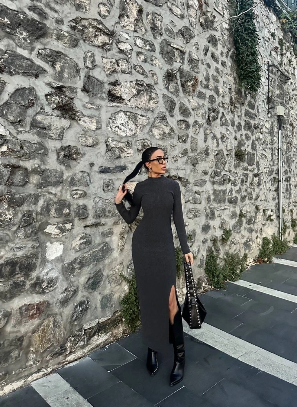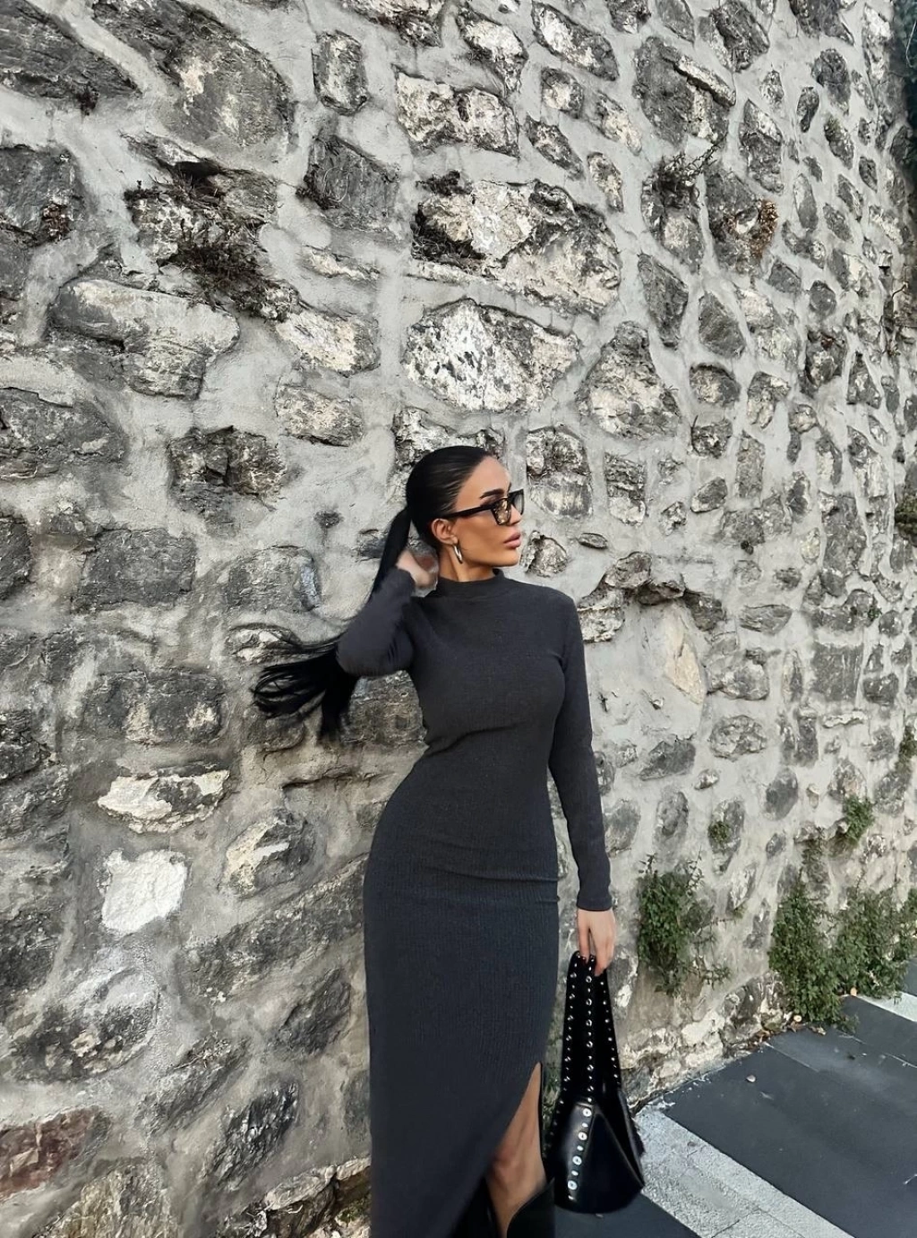 Yırtmaçlı kalın bürümcük uzun elbise siyah, şıklığı ve rahatlığı bir arada sunar.